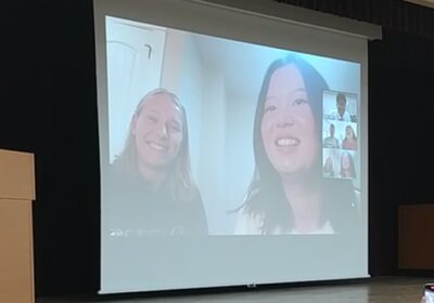 私とD先生のウエルカムスピーチから始まり、カナダとニュージーランドに留学中の生徒と会場をオンラインでつないで留学の様子を語ってもらいました。